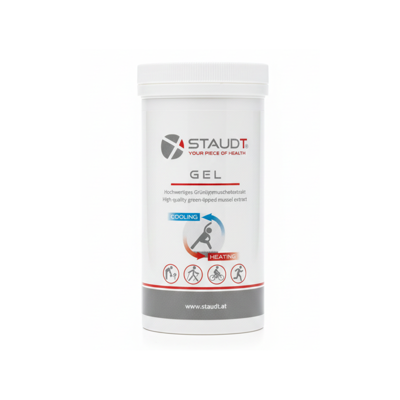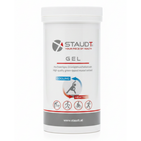 Il prezioso gel STAUDT® per i dolori articolari si applica al mattino e alla sera prima di indossare i bracciali terapeutici STAUDT®. Ha un buon profumo, non unge e viene assorbito rapidamente. Il gel di alta qualità, prodotto secondo la nostra ricetta, contiene preziose sostanze vitali dall'effetto ottimale: glicosaminoglicani della cozza dalle labbra verdi (Perna Canaliculus, allevata in Nuova Zelanda secondo gli standard internazionali di qualità), oli essenziali vegetali di wintergreen, amamelide (nuova), eucalipto, aghi di abete rosso, rosmarino, tra gli altri, in una nuova composizione migliorata, nonché mentolo rinfrescante. Il gel STAUDT® prima si raffredda piacevolmente e poi ha un piacevole effetto riscaldante.